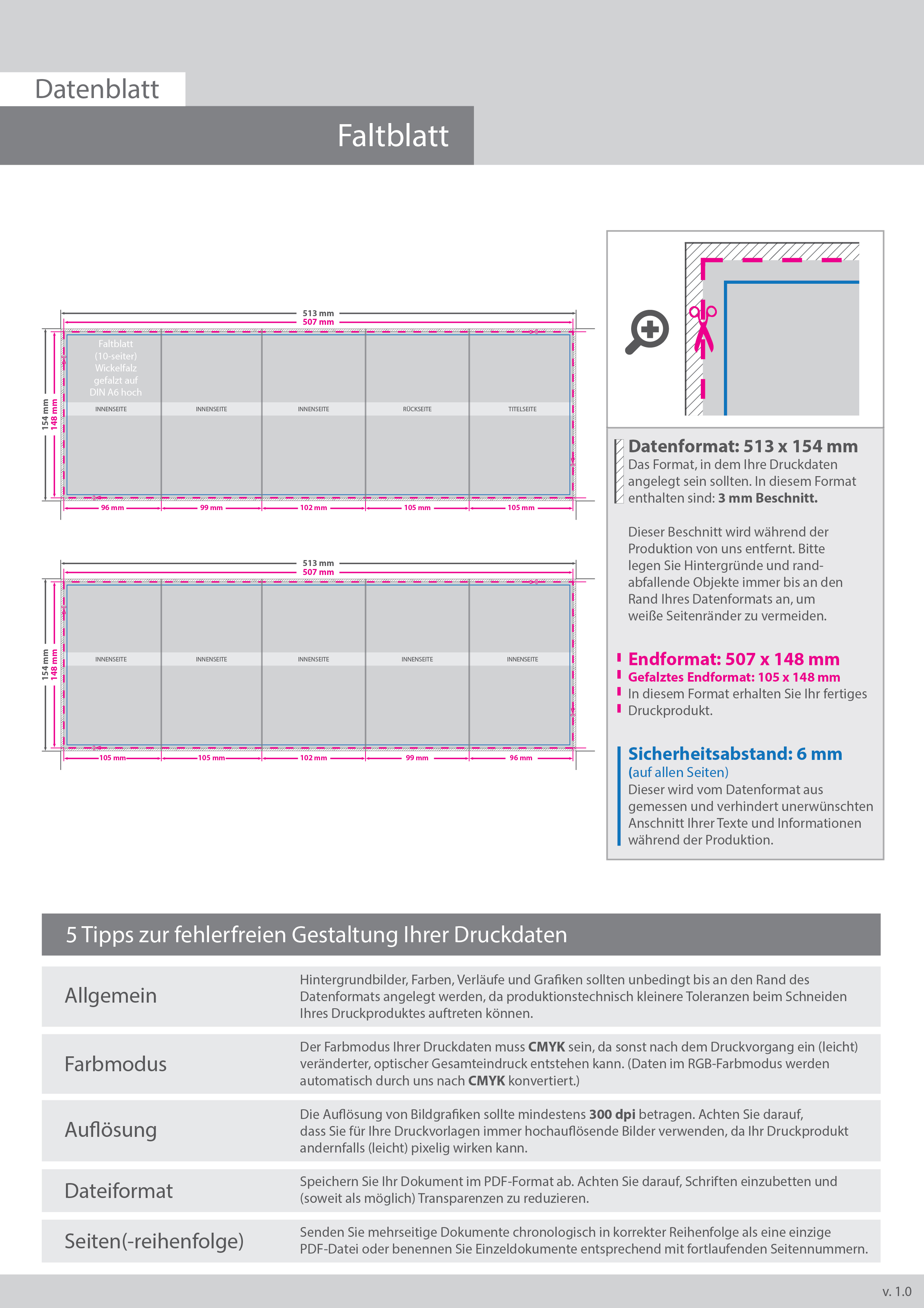 Faltblatt, gefalzt auf DIN A6, vertikaler Wickelfalz, 10-seitig